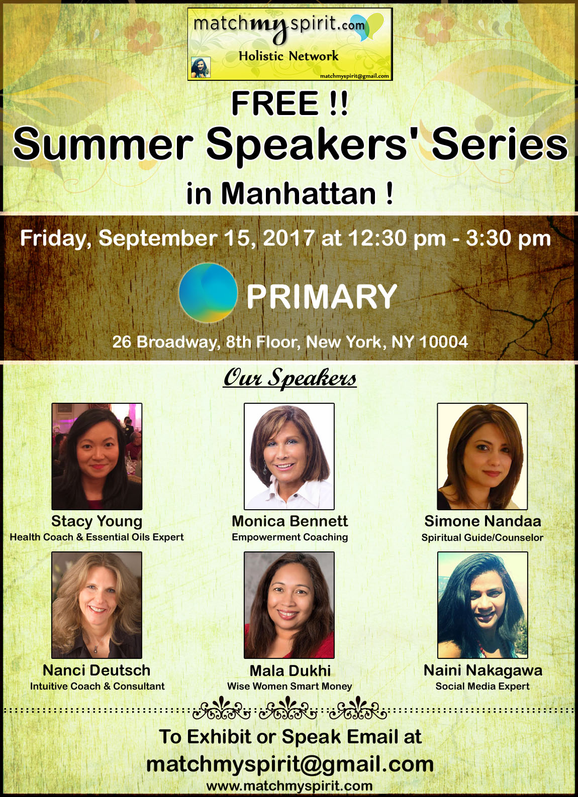 Join us for a free summer speaking series in Manhattan ! Come by enjoy holistic services, make new friends and relax.