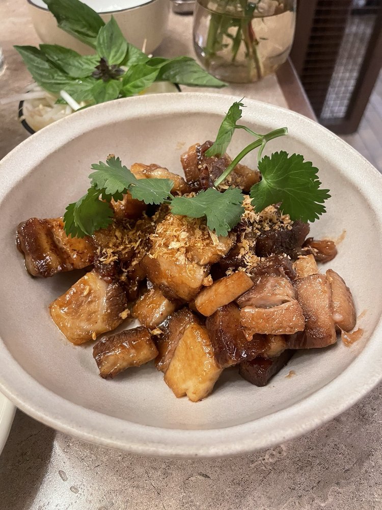 - KROB KEM PORK BELLY - Tossed fried pork belly coated in caramelized shrimp paste, Palm sugar, Cilantro ๐ท๐ฆ๐ฟ