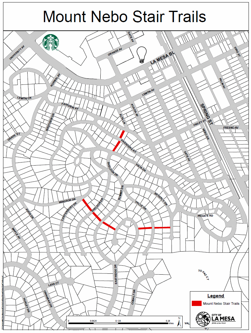 We'll be walking up and down the famous Mount Nebo Stair Trails next to Downtown La Mesa. The total distance is only about a mile and a half, but there are lots of STEPS, so the pace will be quite slow. There are good views from some places.